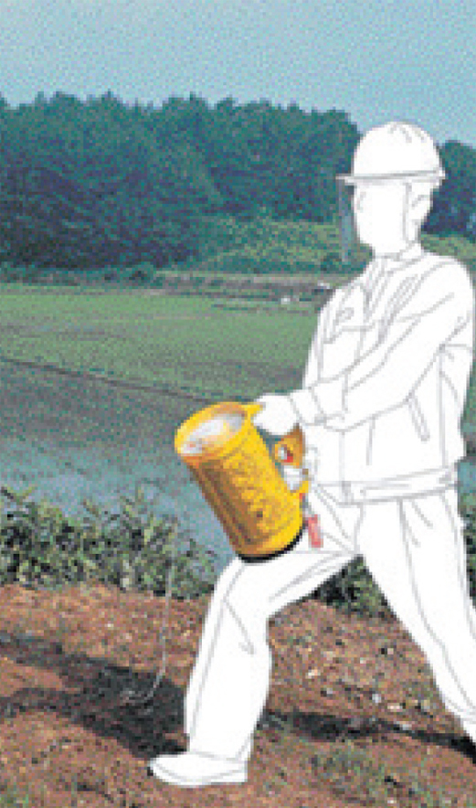 허벅지에 발사기를 고정시킨 후 왼손으로 발사기 상부손잡이를 잡고 오른손으로 안전핀을 제거한 후 방아쇠 손잡이를 잡고 방아쇠를 당기면