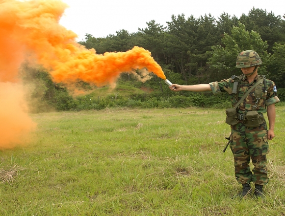 One end releases red illuminant for night-time use. The other end releases Orange Smoke for day-time use.